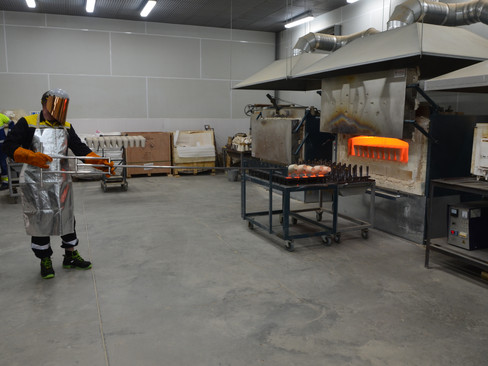 Продукт электролитического процесса – невзрачная серая масса закладывается в большой тигель, где с нагревом до 1300 градусов выплавляется золото. Оно льется струей, разбрызгивая пустой шлам, и остывает в четырехступенчатых изложницах. Потом обычной щеткой отмывается в эмалированном ведре.
